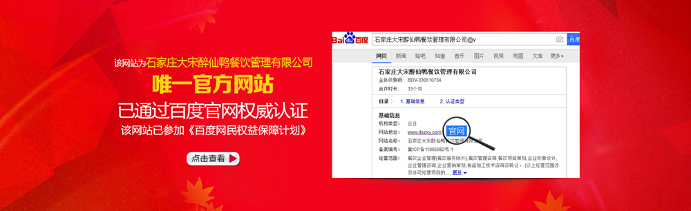 隨著產(chǎn)品的升級,大宋醉仙鴨總部的經(jīng)營理念不斷提升,經(jīng)營的規(guī)模不斷擴大,之后又陸續(xù)開了多家直營店。2014年3月,石家莊大宋醉仙鴨餐飲管理有限公司正式成立,之后在國家商標(biāo)總局申請注冊“大宋醉仙鴨”商標(biāo)。